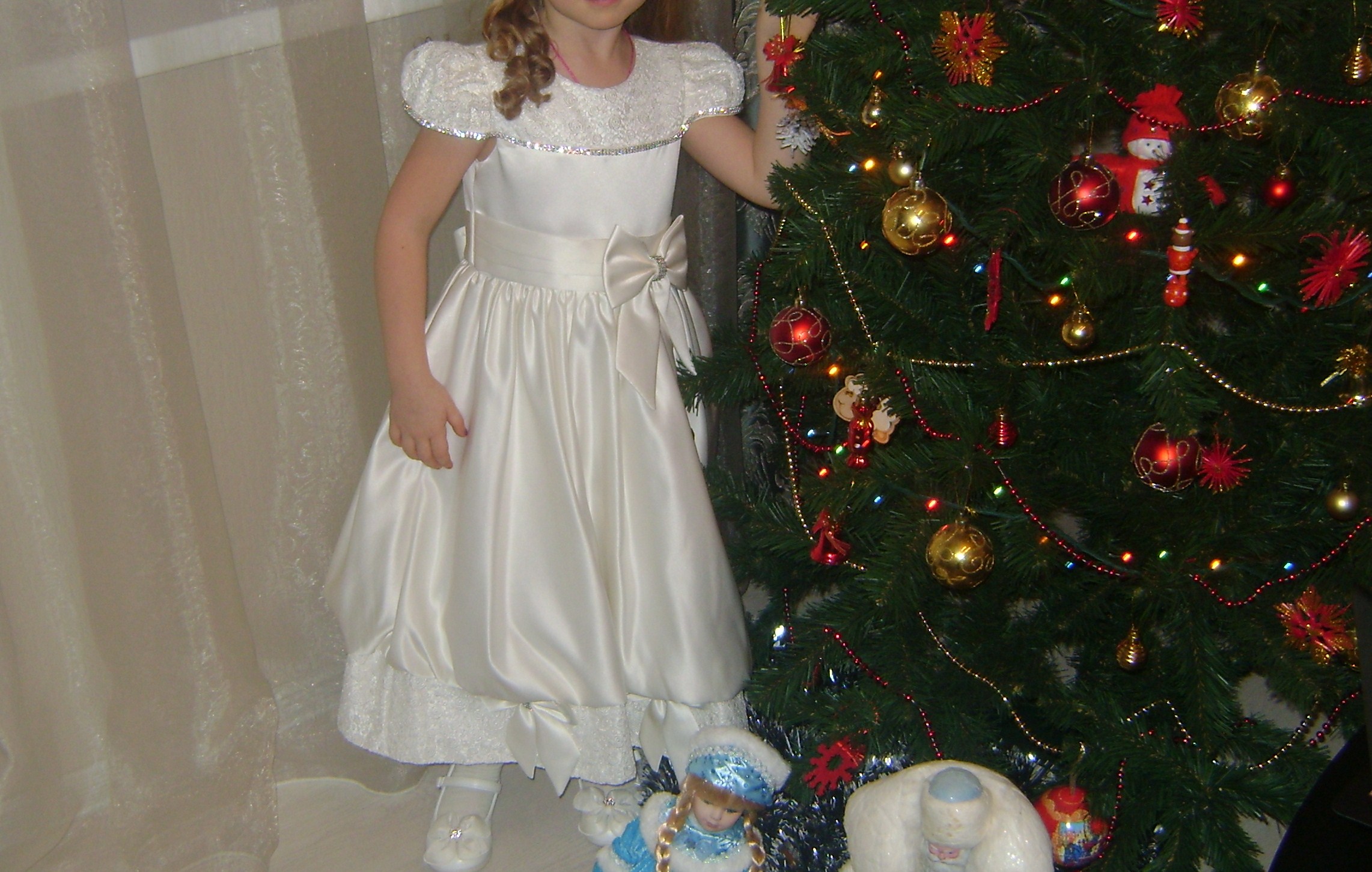 Нарядное платье для девочки, фирмы Елена и Ко.. Платье атласное с кружевной кокеткой и оборкой по низу юбки, украшено бантиками и стразами, с красивыми рукавами фонариками, застежка сзади молния, пояс завязывается сзади бантом. Платье на хлопковой подкладке, капроновый подъюбник.