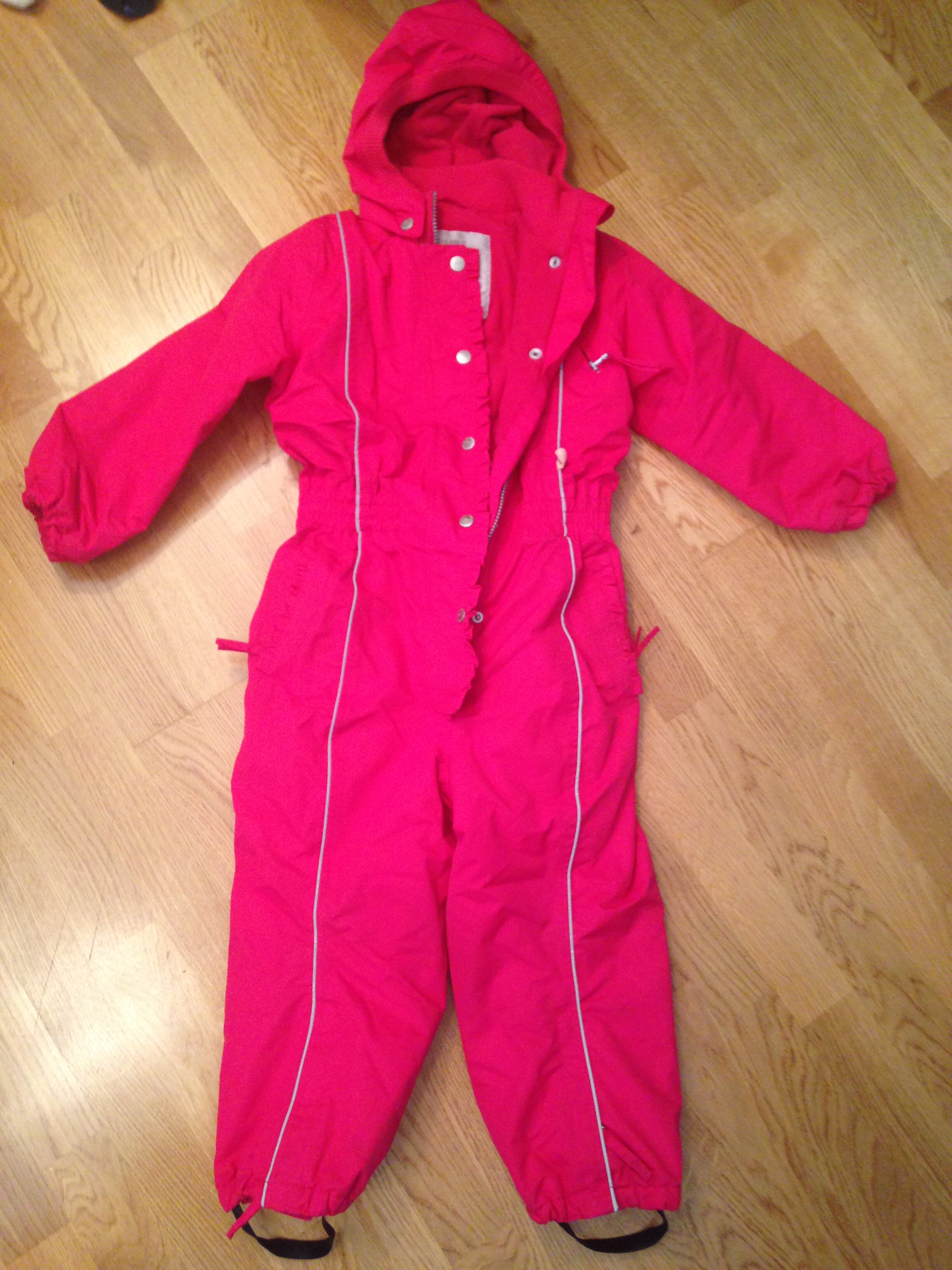 От +5 до -25, с поддевой очень тепло. Спинка и грудь утеплены флисом, попа дополнительно утеплена. Цвет насыщенный ягодный.
